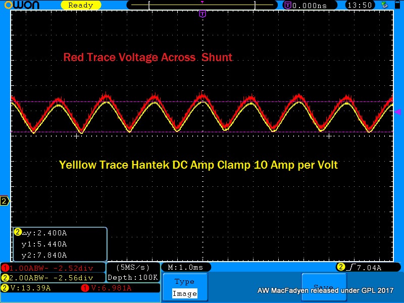 The second is problem with the original setup getting the current measurement scaled correctly Ohms law seems to be letting me down as to read current directly I need to set the scope's probe setting to 40 amp per Volt (25mV/Amp). My scope has this custom probe option I know most automotive scope don't.