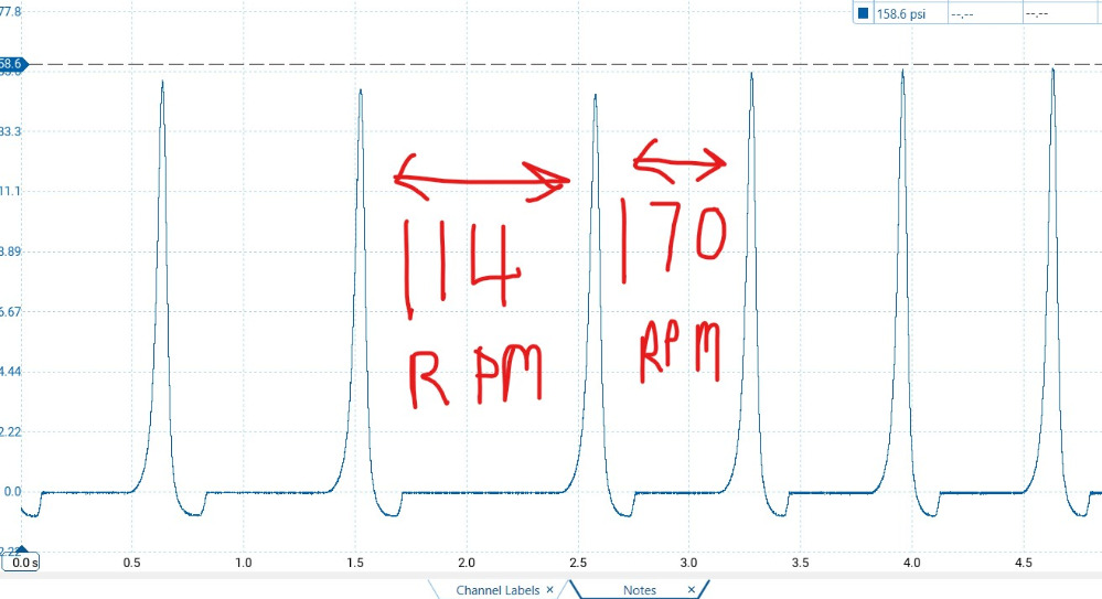 The time-base of the captures is a little low, though. With only 5 seconds on the screen and cranking speed, there is only 6 compression events. That is not enough time for the cranking speed to stabilize. I can see on cylinder #3 that it has a drastic change in RPM, from one revolution to the next.