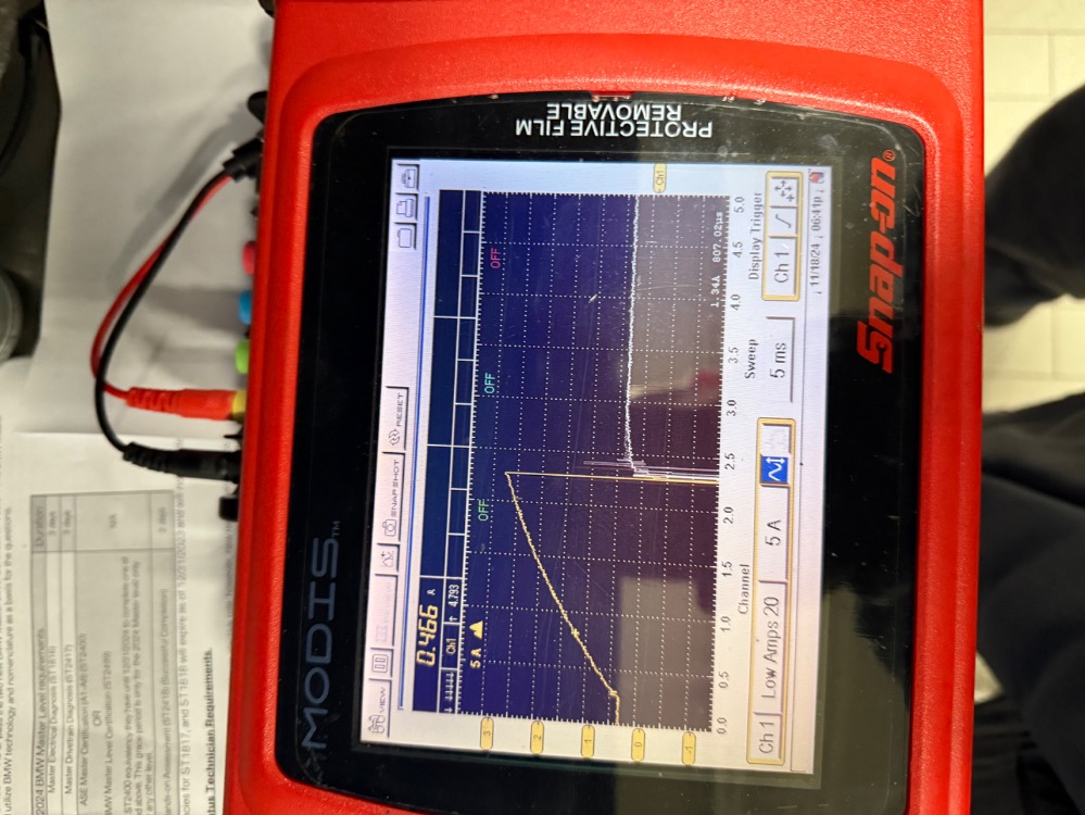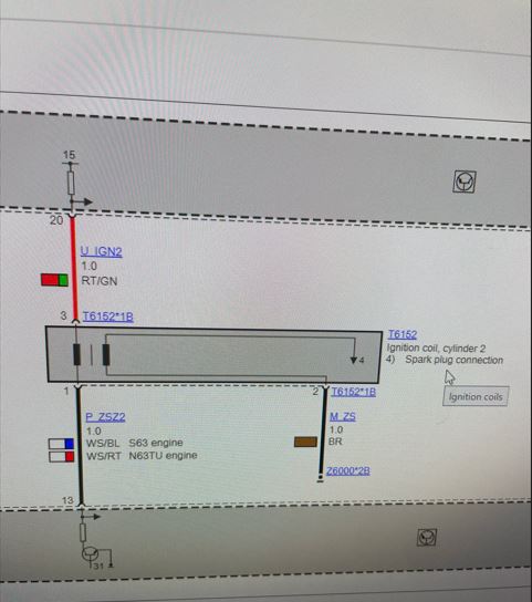 Attempting to develop a technique for bench testing bmw ignition coils. These are the rod type ignition coils (Delphi PN 12 13 8 616 153). They are shielded and attempting to use a paddle probe for secondary ignition pattern when installed on vehicle does not work. The best thing I have found is to use low amp probe and clamp around the supply wire for coil and check current ramp. I will attach pictures of wiring diagram, a scope capture of a shorted and a good ignition coil. You can see that when these coils fire, they fire at nearly 10 amps, so this is not a circuit that you could fire off using just a test light.