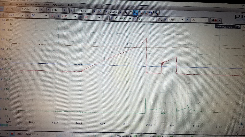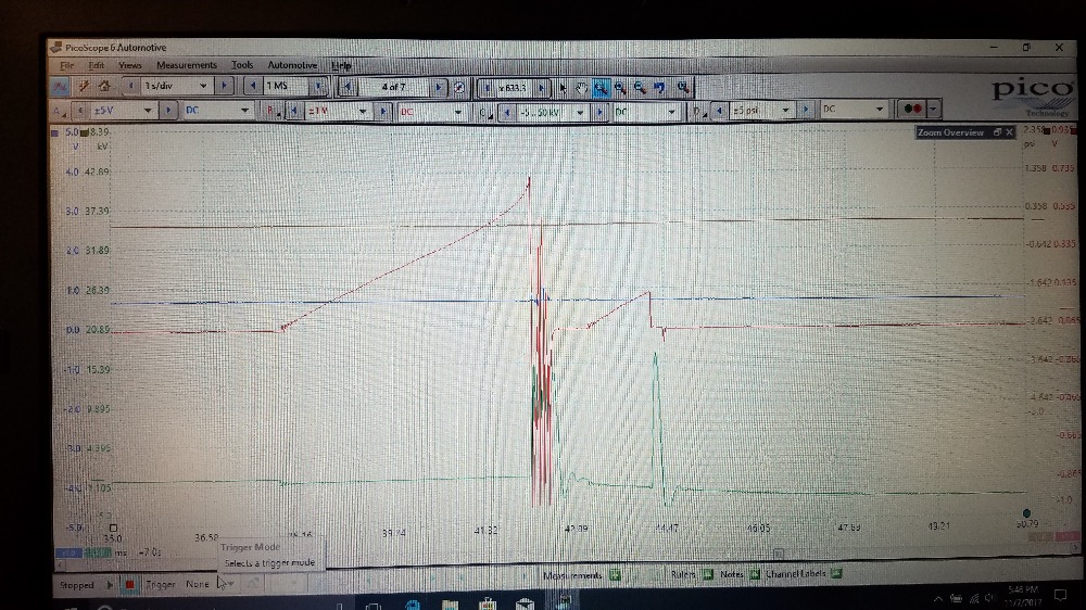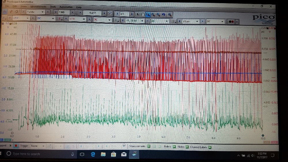 Using a Pico I graphed exhaust pressure at tail pipe ( for synching the misfire to the waveform ), fuel injector voltage cylinder 2, primary coil current parade, secondary ignition cylinder 2.