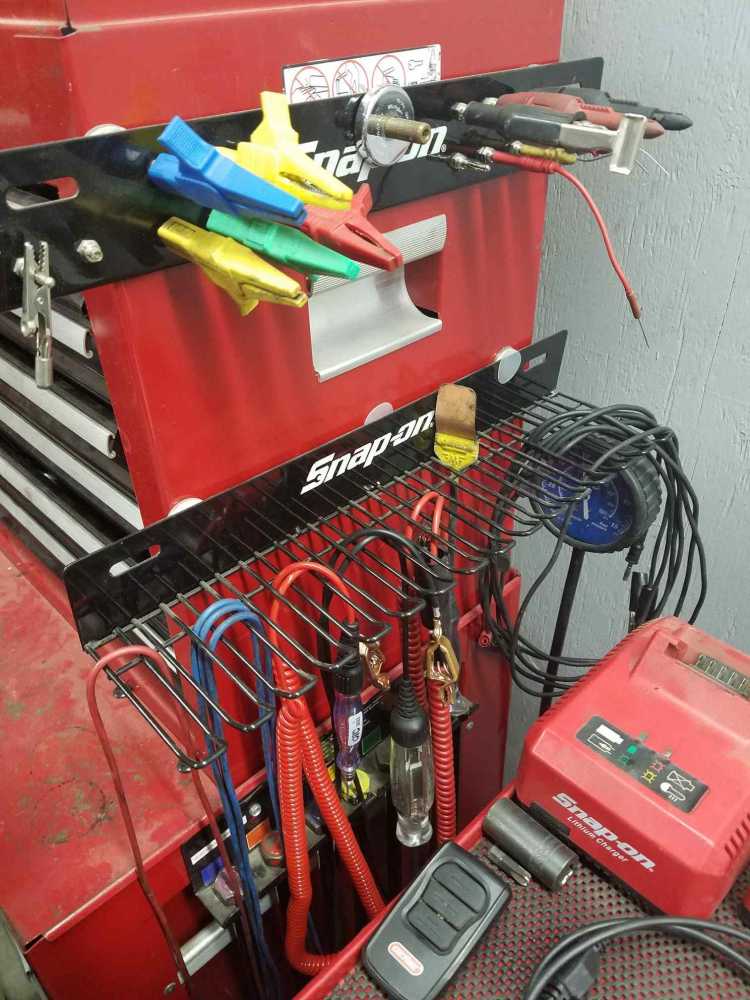 That is pretty cool looking. Definitely way better than when I had everything just crammed in a drawer. I would dig having everything right there and just being able to grab something. But I'm not sure if that'd work for me being sent all over the place. Plus I always like collecting and making new leads and attachments. Some of it takes up a bunch of space. Like the PowerProbe stuff I scored recently. I don't like logic probes so I didn't want a PowerProbe but I was always jealous of its long cable to the battery. I talked to my Snapon rep and, sure enough, he had warrantied a few of the PowerProbes so he had a bunch of that stuff just lying around and gave me some clamps and cables for free. They're awesome, I use them all the time. This way when I'm doing testing I know I always have access to a good clean ground and power. Plus they're banana jack ends so I can just directly plug leads into them then to my multimeter or scope. The only problem with them is each one is 20 feet long so even wrapped up they're each the size of a large burger... heh