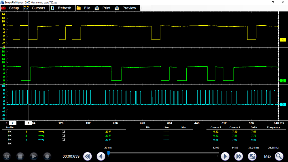 I just happened to have a perfectly good running 2005 Nissan Murano on the lot, so I parked it behind the no-start Murano and hooked up the leads exactly the same and plugged in the scope without changing any settings.