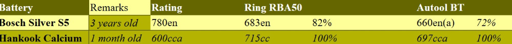 Batteries used were a 3 year old Bosch Silver Calcium 096 and a Hankook MF56219 Heavy Duty 027 the results were broadly as expected --- the Hankook punches above its' weight