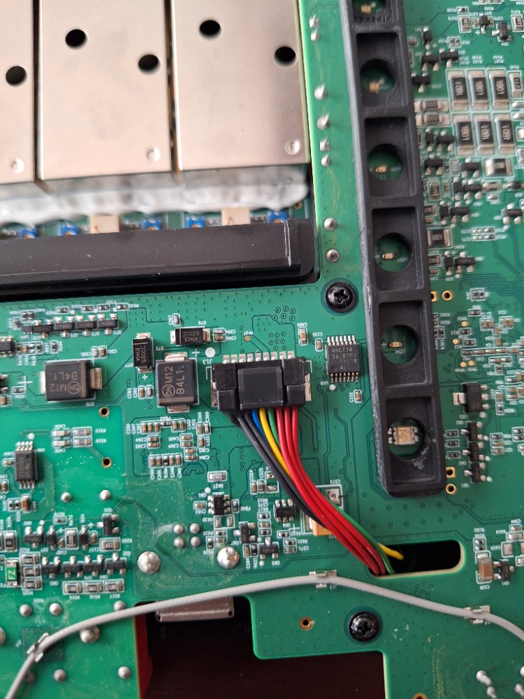 Flip the guts of the VCMI over to find the battery cable connection, covered with a bit of fabric tape. Pops off with a pocket screwdriver blade.