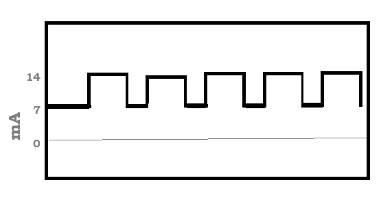 The hall effect digital on/off/on square wave BUT because there only two wires the sensor is powered and grounded through the same wires the signal current is superimposed on the 7ma or so current used to power sensor.