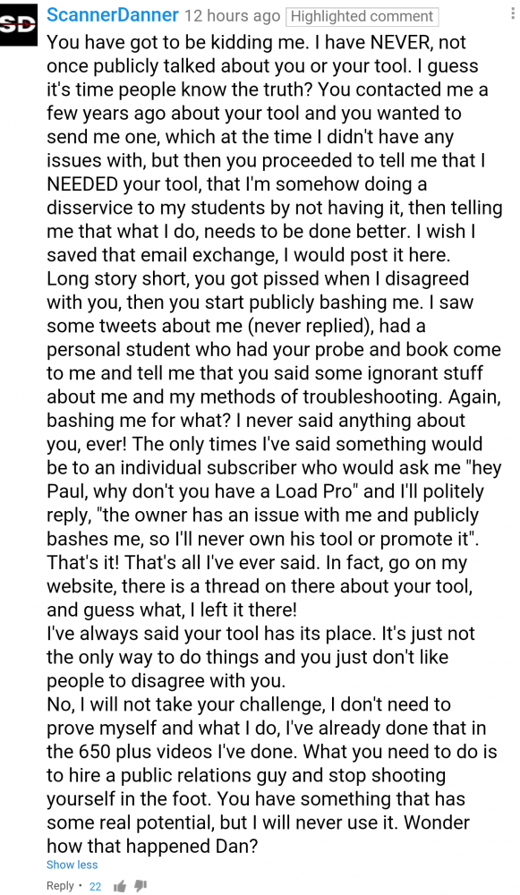 I feel as this continues, that Dan is going to delete or disable comments on his video, so I've copied my comments and his replies so my future forum readers and subscribers will know first hand why I do not use or recommend the Load Pro.