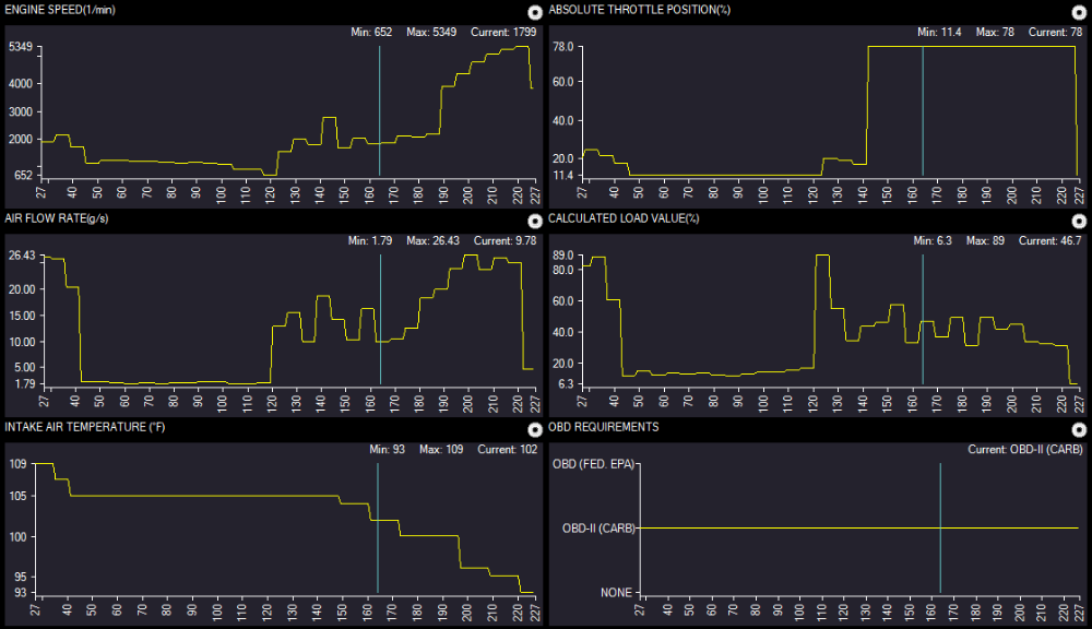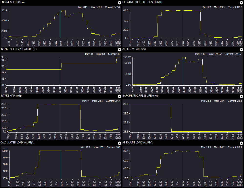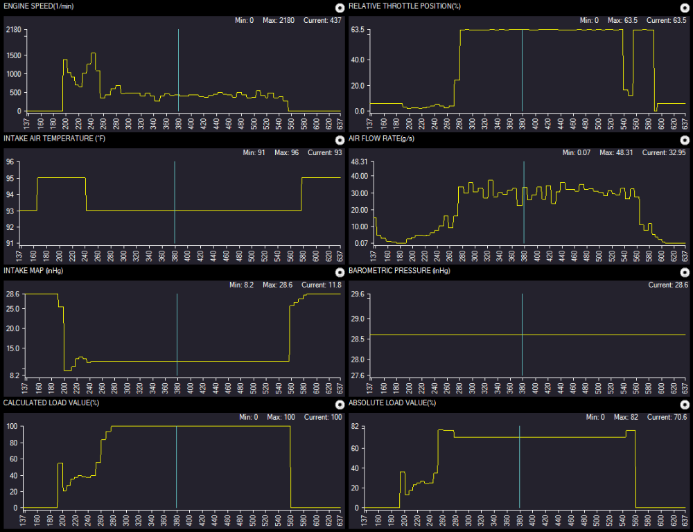 '07 Ford F-150 has a noticeable lack of power from a stop, and at WOT. I took a drive with Global data, and saw these (reduced the PIDs down to the relevant parts):