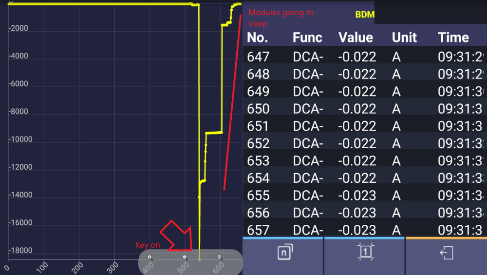 Don't sweat the negative polarity - all the values are accurate. We start out at 18A, then settle out at 23mA after all the modules STFU. I leave my phone on my cart and roll off to other jobs. After an hour, I can see that no other draws cropped up: