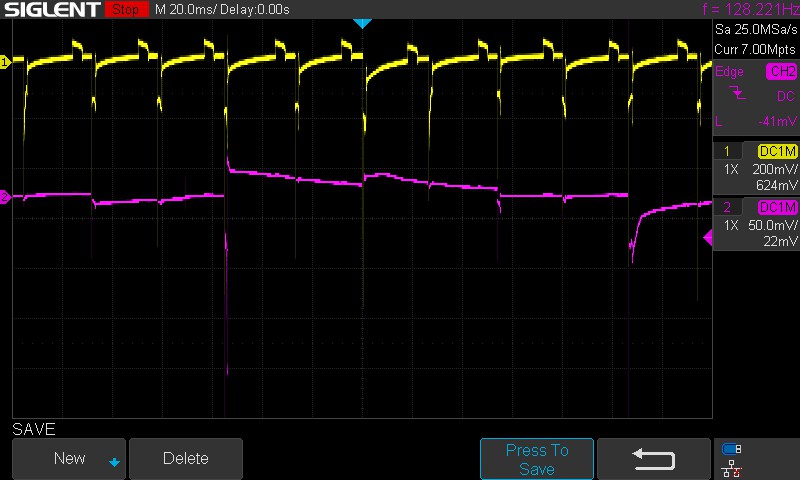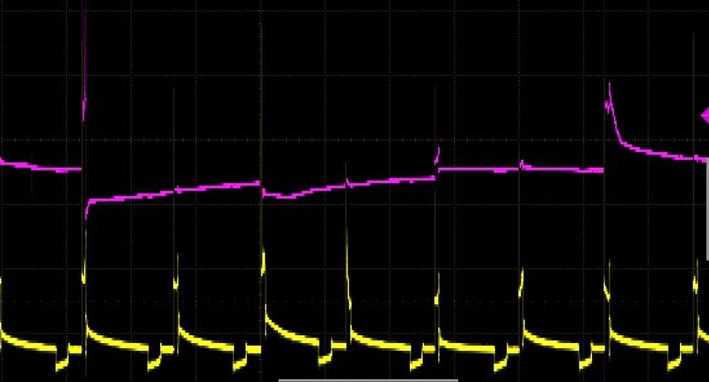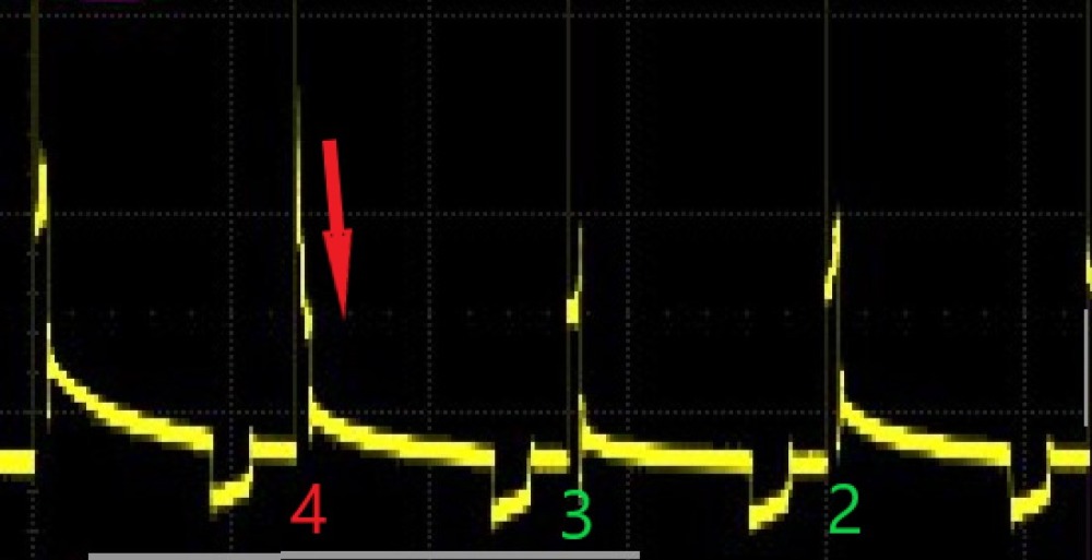 I've watched Eric O. on YouTube use wave form diagnostics to pinpoint a problem.. I was hoping I could too. I just bought a brand new digital storage o'scope (really for electronics work, not automotive) but since I have two inductive pickup probes.. i figured why not. I've looked at these screen shots, but with no idea what I'm looking at.. the only thing that jumps out at me, is the #4 pulse is much shorter than the rest...