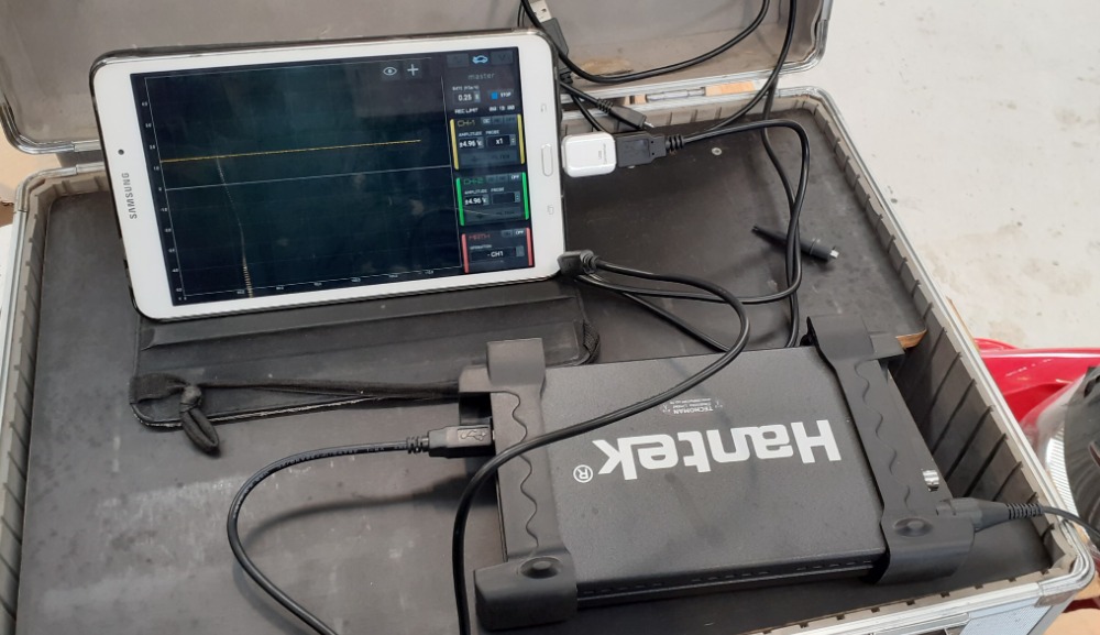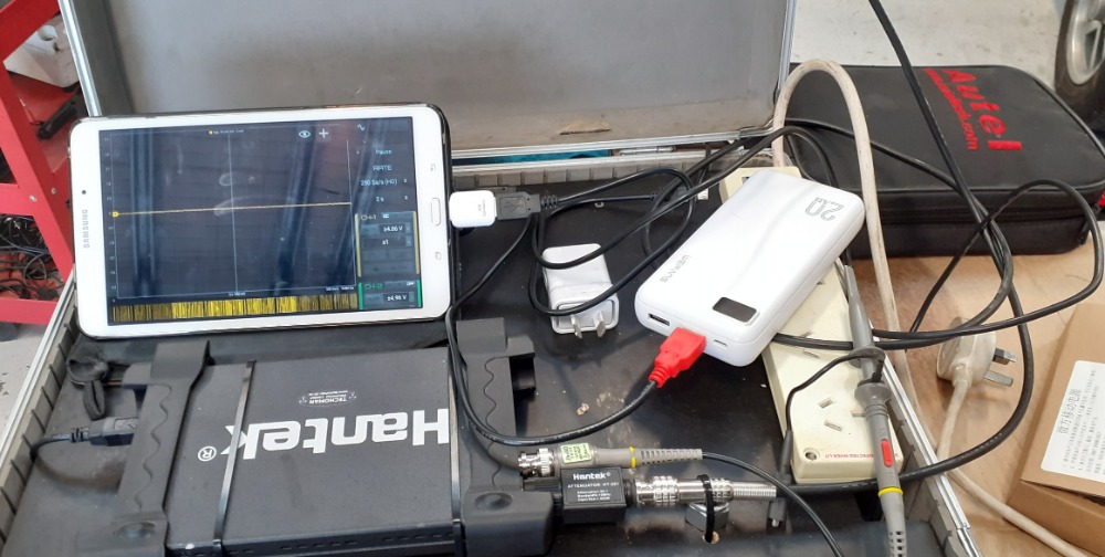 With the red USB of the Hantek plugged into a phone charger and the other one plugged into my tablet it ran