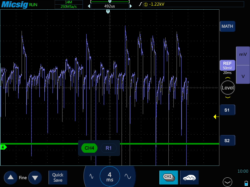 So totally new to DSO's seen them a lot and read a ton of articles and have been following up on some of scannerdanners training. But I have a 1993 Chevy 1500 silverado with the 5.7 Liter. And I am using a Micsig scope. with an inductor clamp on the spark plug wire. Going to move it to the primary coil wire to see if I can get a better overall view later today. The truck has a light miss when warm.