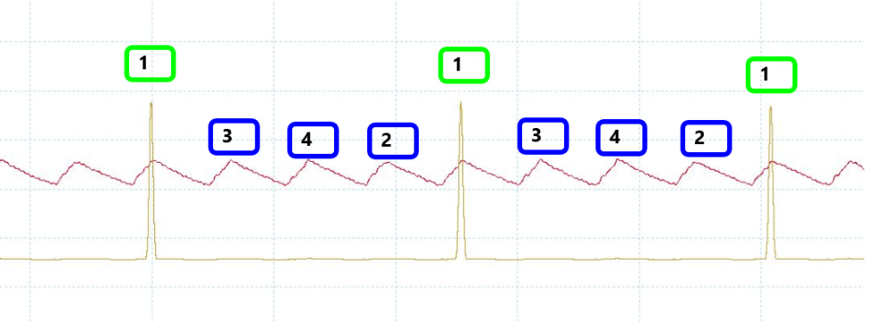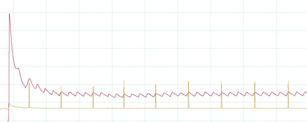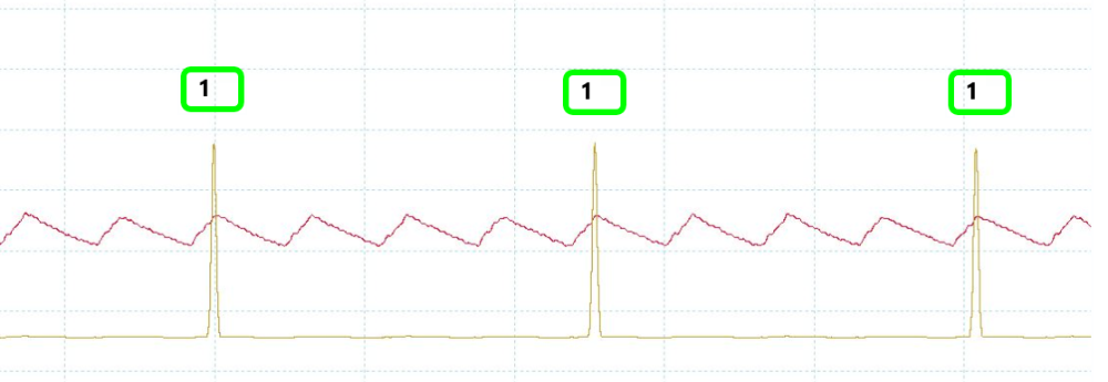 If we add a second yellow channel for an ignition strike on cylinder #1, we can now see that this is a 4-cylinder engine, with #1 spark plug firing in yellow.