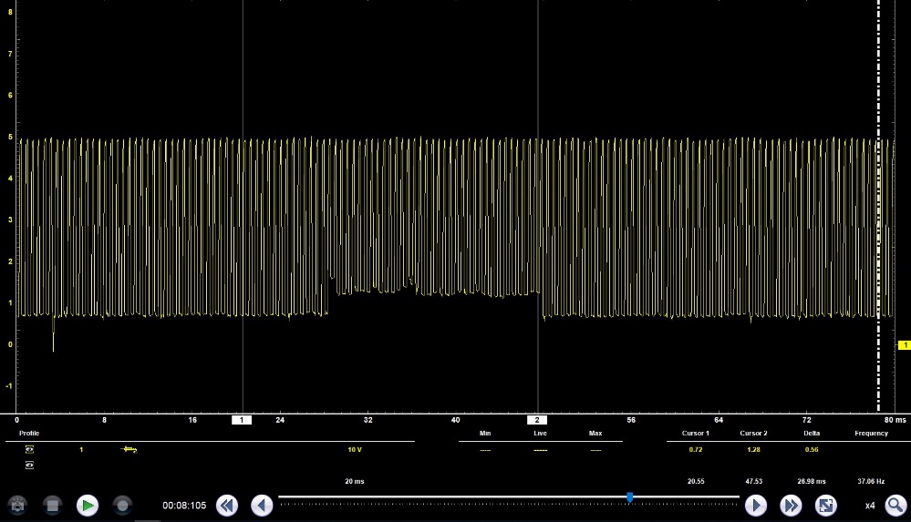 As you can tell I am pretty darn ignorant about this stuff, this is totally new to me. I am curious about both, you summed it up better than I did! And I may be off base here, I was wondering about a bad sensor input signal, and also if I were testing a component, like a motor, how would the PWM signal look if the motor has a problem, lets say a cooling fan or fuel pump motor. I do understand that an oscilloscope would be much better for this, but could/would a PWM signal indicate a glitch? I am trying learn as much as I can, about as much as I can:) before I purchase an oscilloscope. This way I am not totally in the dark. I do watch Paul's videos and I purchased his book and am following along in his course, Absolutely excellent, one of the best discoveries that I have ever made . I watch videos, Pico, TST, Motorage and Eric O's at South Main Auto. However the PWM some what puzzles me. I do understand the duty cycle%, I do understand pull up and pull down circuits and how to identify them on schematics. I hope I gave you enough info this time! When I was a kid, my dad nicknamed me "the kid with 10,000 questions." And at 63 I have not changed. Learning is challenging the brain, better than watching the news. I am not totally ignorant about automotive electronics. But the depth of the subject matter is fascinating to me. My wife calls me an information sponge. I am lucky I still have her, the choice was between my figure 8 car and her, she is still here, its gone. To much time in the garage and not with her. That went on for years, her patience ran out. Now I do project cars, keeps her happy, keeps me busy. Anyway, I apologize if I am being a pest. I know your busy, take your time if you chose to answer, but any input would provide me with avenues in which I could do further research. Thank you, and thanks for the picture.