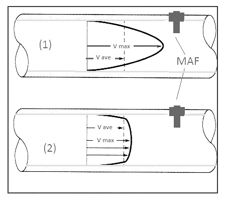 Without a screen the MAF sensor is reading a point on a velocity profile similar to (1) but was calibrated for a velocity profile similar to (2).