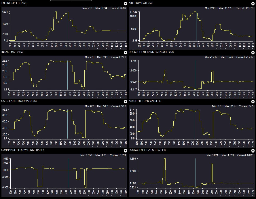With those PIDs, we'll be able to tell if the engine is getting enough fuel under load, as well as check for a volumetric efficiency issue, an intake restriction, AND confirm the rationality of the downstream O2.