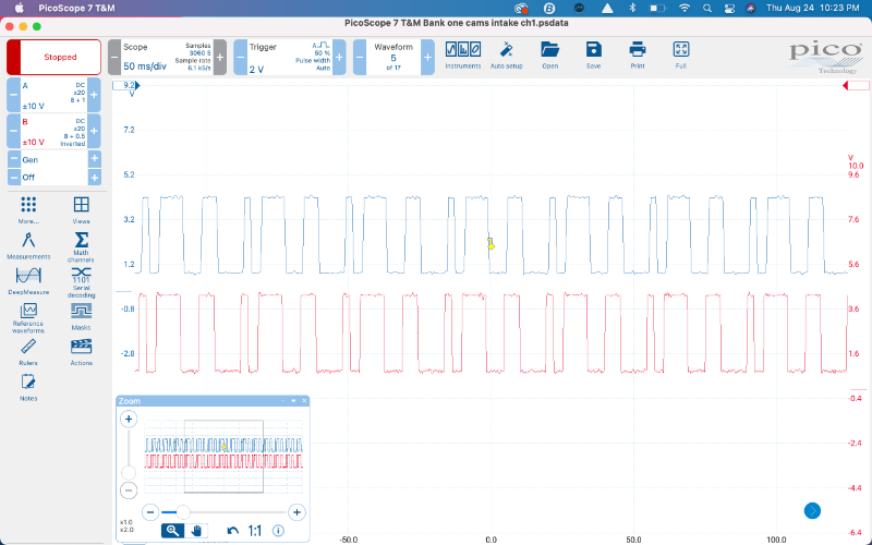 I personally don't see anything that sticks out but I am not trained in what to look for. The only thing that didn't seem to match was the correlation between the intake and exhaust cams varied between banks. If you look at bank one, the waves almost match, large, medium and small as if you could lay them on top of one another. But with bank 2 there seems to be about a 10-12 milisecond delay between the large signals as they start? Now this could just be how the motor was built? I couldn't find any "known good" waveforms for this motor online anywhere.