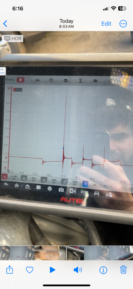 I grab a secondary ignition waveform. but first I grab a known good. the first picture is a capture of a known good. the second capture is #7. sorry for the bad pictures. the only anomaly that I see is the firing line is way higher. the others spike to a max of like 3kv, and #7 spikes to sometimes over 6kv. at idle. I swap spark plugs and coils anyway, no change in miss and high spike stayed in #7