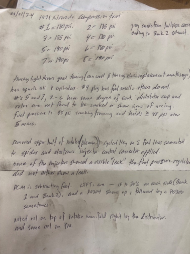 My truck started to misfire out of nowhere. Limped it to my fathers house so we can have a look. short term fuel trims on bank 1 were just fine, bank 2 side were awful at -30.5%. long term fuel trims on both sides were between 10-18% (cannot remember +\-). checked everything except for noid light testing. will attach notes on tests. everything on ignition side looks satisfactory. i had grey smoke that reeked of fuel coming from my bank 2 exhaust pipe. fuel injectors were checked for leakage but they did not leak. fuel pressure regulator also does not leak. compression was great. sparkplugs 2 4 and 6 had sooty residue, sparkplug 4 smelled of fuel. sparkplug 8 looked fine. bank 1 side plugs were satisfactory. distributor cap and rotor had no issues.
