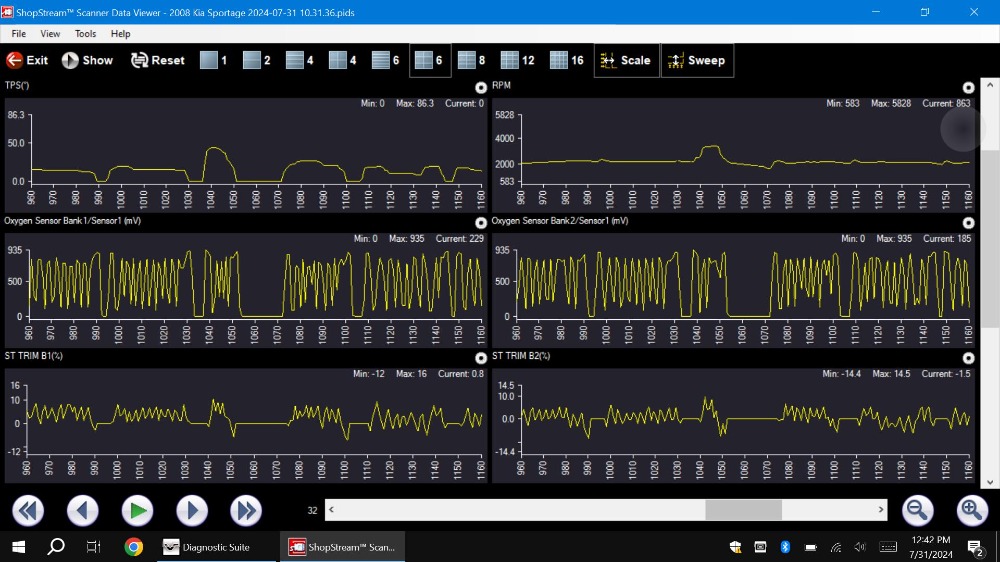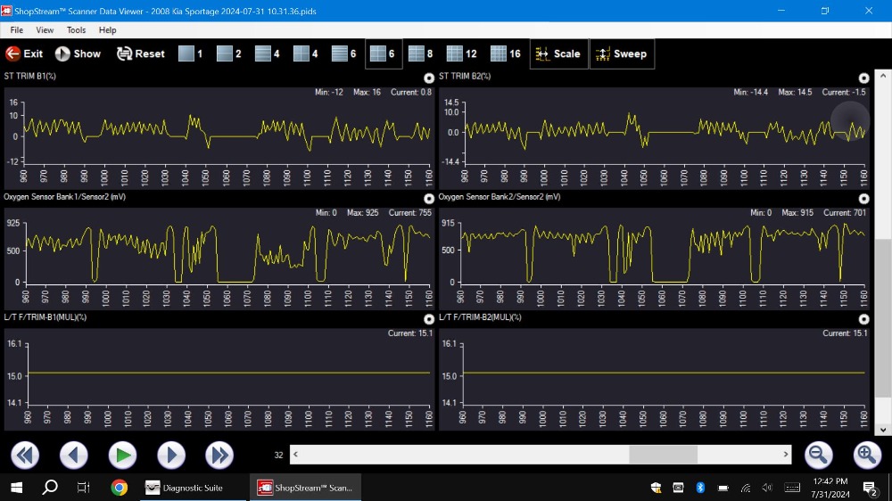1. It appears that all of the Oxygen sensors are working correctly, they can switch lean/rich and the post sensor's are telling the truth. Feedback System appears good.