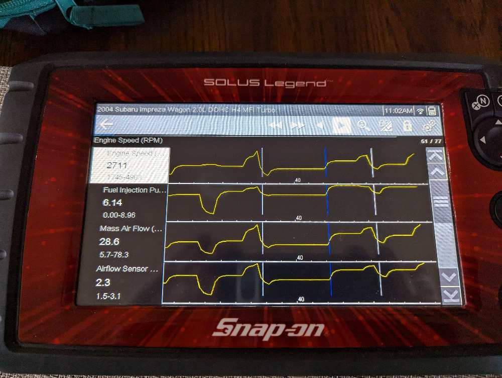Here's a picture of when it's happening. All the parameters just freeze/flatline until they go to normal. Up above the 40 in between the first gray vertical and the blue vertical is an example, and also it happens briefly right after as well. In between the two gray verticals is acceleration in only second gear. If the flat lines were gone you'd see a normal second gear acceleration recording. What you see on the scanner is a direct correlation to what I experience while driving. Every flat line I stop accelerating. Backing off and on the throttle with small inputs does nothing. Coming completely off throttle is always normal and I can push through it by giving lots of more throttle, but sometimes it doesn't feel like it has its normal power, and other times it does