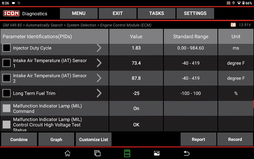After Test Driving and symptoms are replicated O2 Sensor 1 is reading rich around 900+mV and sensor 2 around 950+mV. When pressing the brake pedal rapidly, the idle increases and O2 sensors drop quickly and are reacting. LTFT -25% STFT -27%