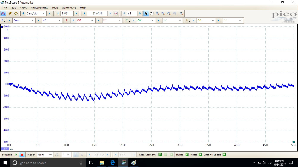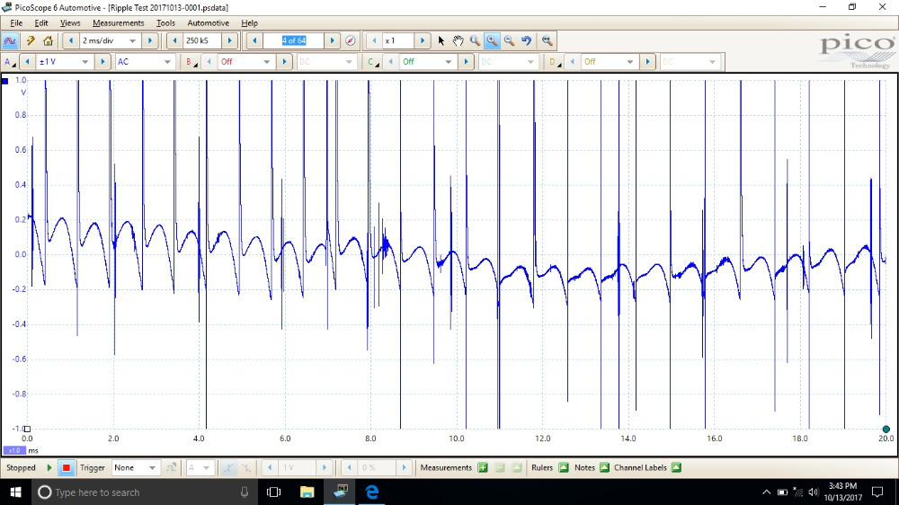 To investigate I decided to take a close look at the alternator. I hooked up my Picoscope to the alternator BAT+ and alternator chassis (ground). At idle with minimal load on the alternator, battery fully charged I got this picture;