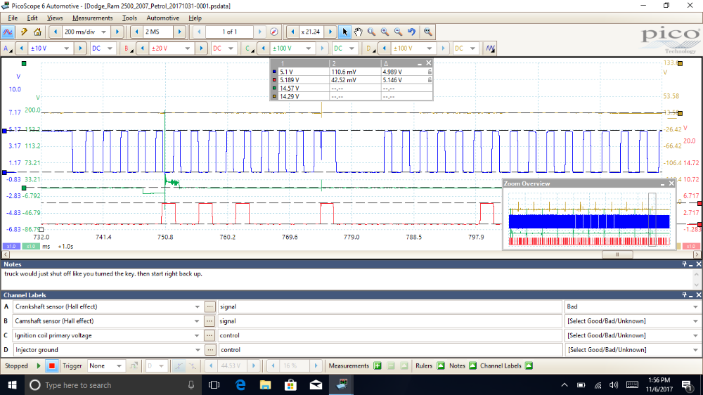 2007 dodge ram 2500 5.7 will be running and just stall. just like you shut the key off. if you hit the key it starts right back up. I scoped the cmp,ckp,injector control and coil control. what I found is the ckp would glitch then it stalls. only 1 little glitch. right after that no injector or coil control. checked ground at the ckp when it happens and its good. so I changed the ckp sensor and pig tail (didn't look to good) started it and ran it for 4 hrs do stall great fix