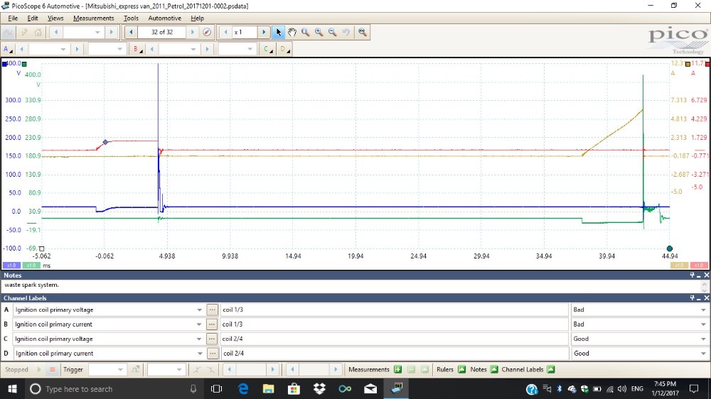 hi everyone. I have a 2011 Mitsubishi express van (think its also called an l400 but I'm not sure) - 2.4l 4g64 engine. I cannot access a wiring diagram via aftermarket means and manufactures in Aus don't have to give out information by law at the moment (we are working on it). this vehicle was towed in with a no start, no fire. died on the customer as he was diving. 1/3 ignition coil is putting out very weak spark, at idle is runs rough with the occasion miss but when revd it breaks down bad. if you drive it, it wont go over 30km/h. found crank angle sensor wiring had been rubbing on the timing belt and suspect shorted these wires. I believe the ignition module isn't grounding that coil properly causing this but without a wiring diagram I'm up shite creek. attached is the wave forms I have from the primary ignition. 1/3 coil has very low amperage and high voltage during the dwell time. does my diagnosis of bad ignition module sound reasonable??