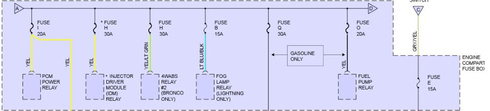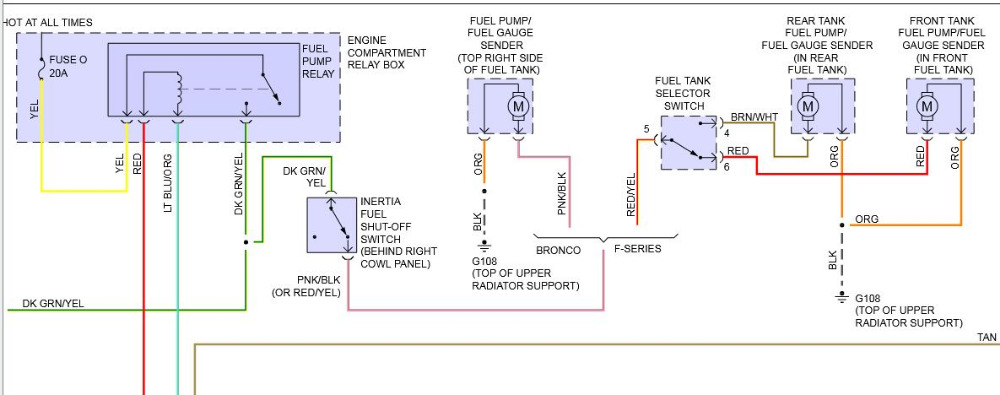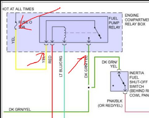 :blink: I can't explain that, at this point. But, if your dropping voltage at the fuel pump, I don't think THAT problem is with the PCM. Power for the fuel pump comes from 20 amp FUSE O, which is in the engine compartment relay box. What voltage do you read at THAT point when energizing the fuel pump? If you get a strong, solid battery voltage, move down the line and check the wire going INTO the inertia switch (DK GRN/YEL), then the wire going OUT OF the inertia switch(PNK/BLK). Keep moving down the circuit, working your way towards the fuel pumps.