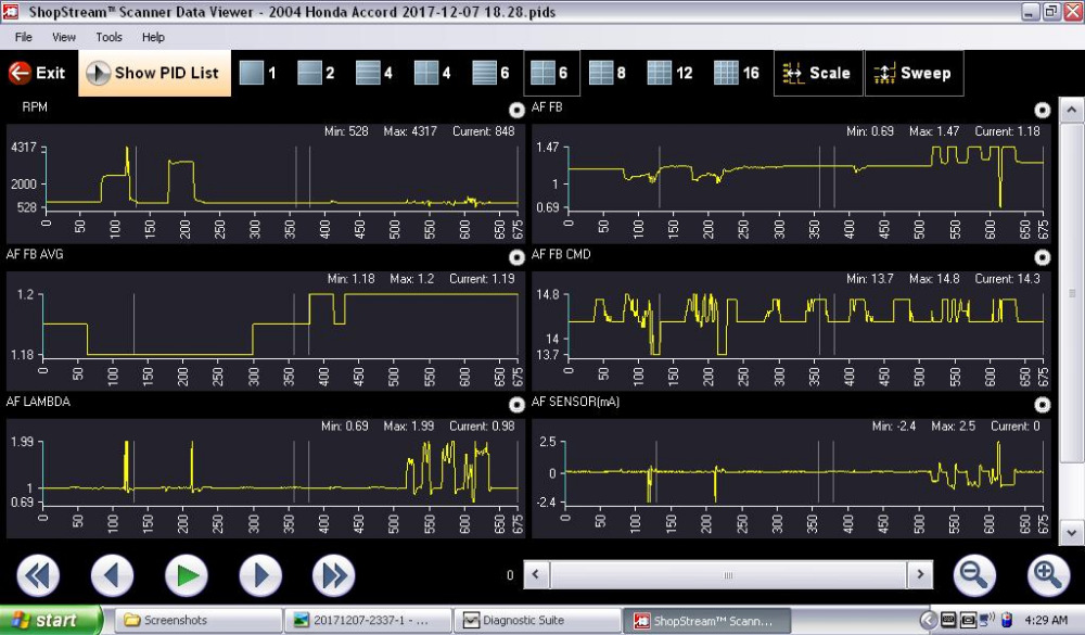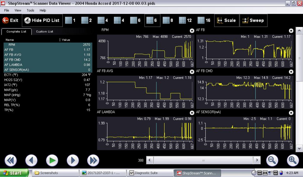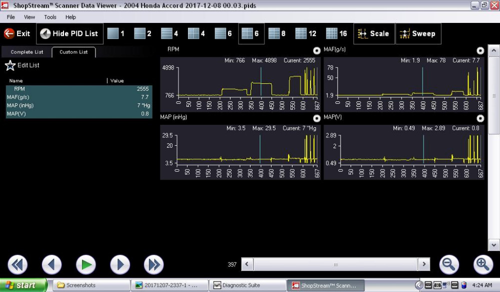 What you are seeing with the MAF at 1.9g/s on the min scale was only momentary. It most likely happened when I pulled a vaccum hose to induce a lean condition and the engine stumbled and almost stalled.