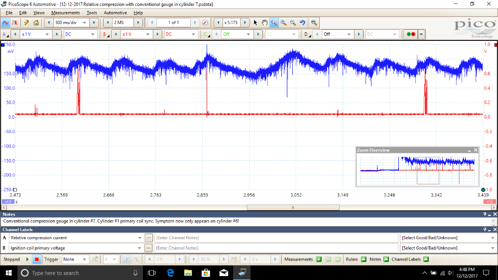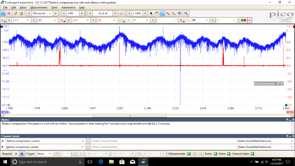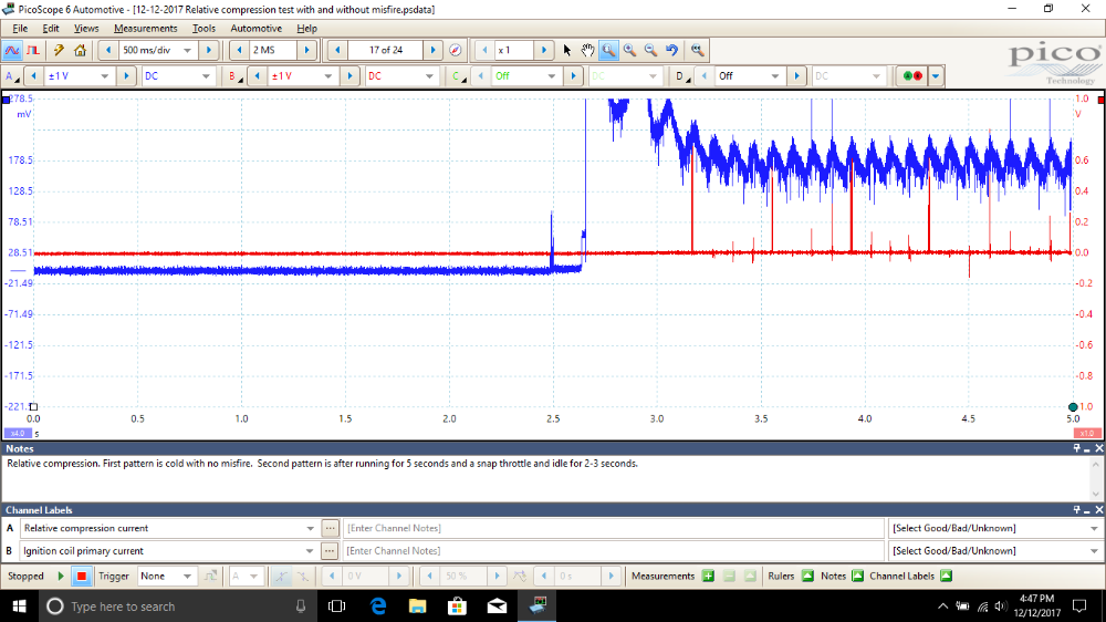 I perform the audible relative compression test again and can clearly hear uneven cranking. Out comes the lab scope. Repeated relative compression test. Here's what I got: Channel A is cranking current. Channel B is primary ignition current cylinder 1.