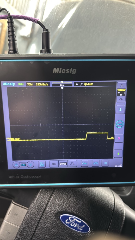 I have been on this van for about 20 hours. It is a hot mess and wish it never came into the shop. I will give as much back story as possible. Truck was started once a week July through September and then towed to a shop up the street for a no start. Tech up there said it didn't have fuel pressure at the rail. Tech stalled on repairs for 2 months. The truck was towed in last week to my shop. Verified no fuel pressure/pump activation. Rail sensor reading 16psi Found FPCM corroded in half and suggested replacement and continued evaluation. The truck gained fuel pressure after replacement of FPCM. The rail pressure remained the same on the rail sensor at 16psi, actual was 40psi with a gauge. Inspected FRPS and found it to also be corroded and broken as well as the pigtail. Checked injector pulse, present, checked spark, present. Checked RPM on dash and in a scanner, verified. Hooked up my oscilloscope and found that I have a clean waveform for both cams and crank. For some reason I am unable to get a waveform for correlation, but both cams are in time. Customer just wants it to run, and I am unsure if the sensor would cause a no start, so I am not going to sell it unless I know it will prevent it to start. We did check the crank sensor and found oil leaking through sensor. I have an OEM in stock, so we used it. The original one was open when tested (2 wire). Grounds for PCM have been checked and cleaned. Still at 7.9 ohms. We have a hot, consistent spark. We have injector pulse, but typically only one then nothing. My injector waveform looks very strange using the amp clamp, 80ms pulse width and a straight plateau, no mountain side. I think it may be in clear flood mode. We did enter clear flood and cranked a few times and tried starting and we got a more consistent noid light flash, but still a bit erratic.