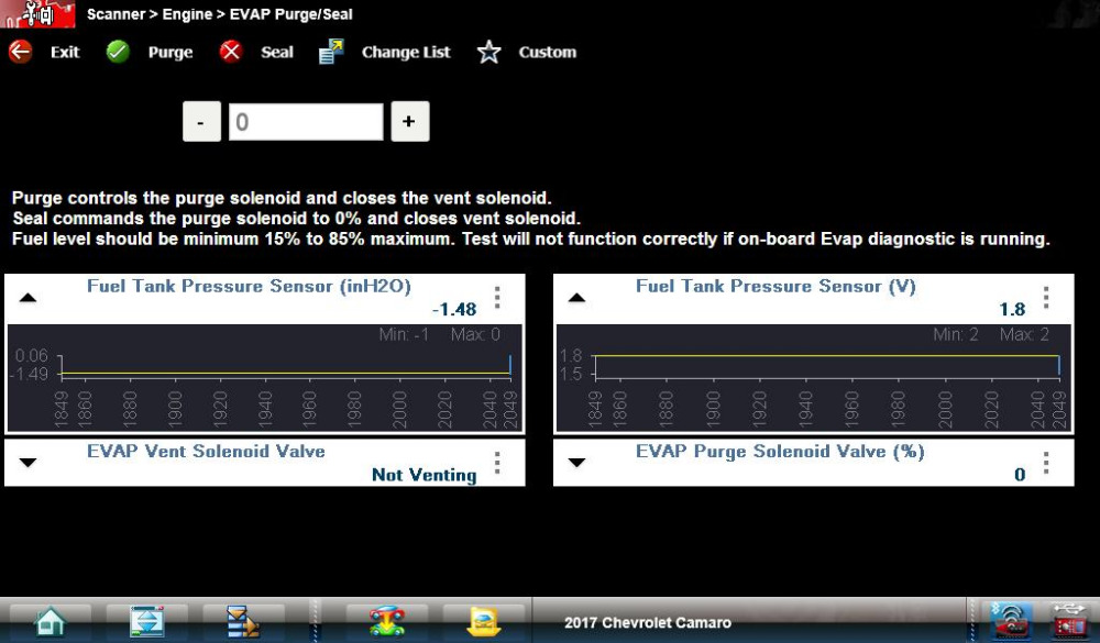 You can use your scan tool to test the purge valve. Go to functional test and find evap purge / seal. Set your custom data list up to show fuel tank pressure , purge valve % and evap vent solenoid valve. now command your purge valve to 0% and seal the system and monitor your fuel tank pressure. it should slowly increase. If it decreases then your purge valve is leaking. The vacuum pump method is more accurate but this method has worked for me on more than one occasion, even with slightly leaky valves. I`v attached a jpeg image of a 2017 camaro that had a slightly leaking purge valve.