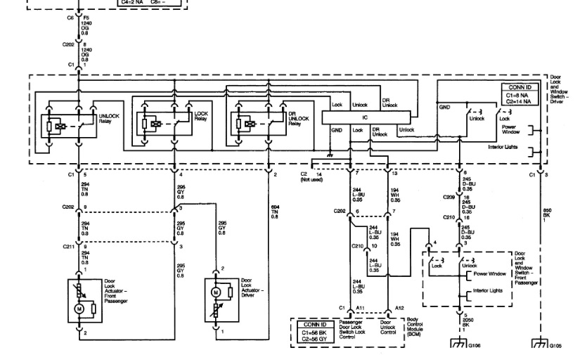 What I suggest is this: Remove the drivers lock/window switch from the door panel, and disconnect C1 (which has the lock actuator wires in it). Connect a test light to B+ and touch on pins 2, 4 and 5. With C1 disconnected, none should light up when probed. If any do, that represents a short to ground in the wiring and not a shorted motor. Find C211 (probably in the passenger door flex) and disconnect it. Now probe those same pins again. If the test light won't light up, then the short is in the passenger door. If it still lights, the problem is in the drivers door. Remove the corresponding door panel and inspect the wiring.
