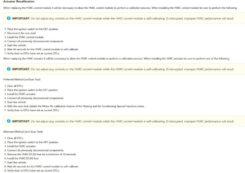 If the HVAC Control Module was replaced, it needs programed, too. The actuators can be recalibrated, without being "programmed".