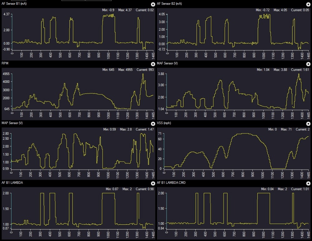 Here's an example of the PIDs you're likely to see during a test drive. 'Lambda' in this case translates to 'Equivalence Ratio' in Global data.