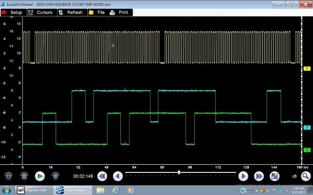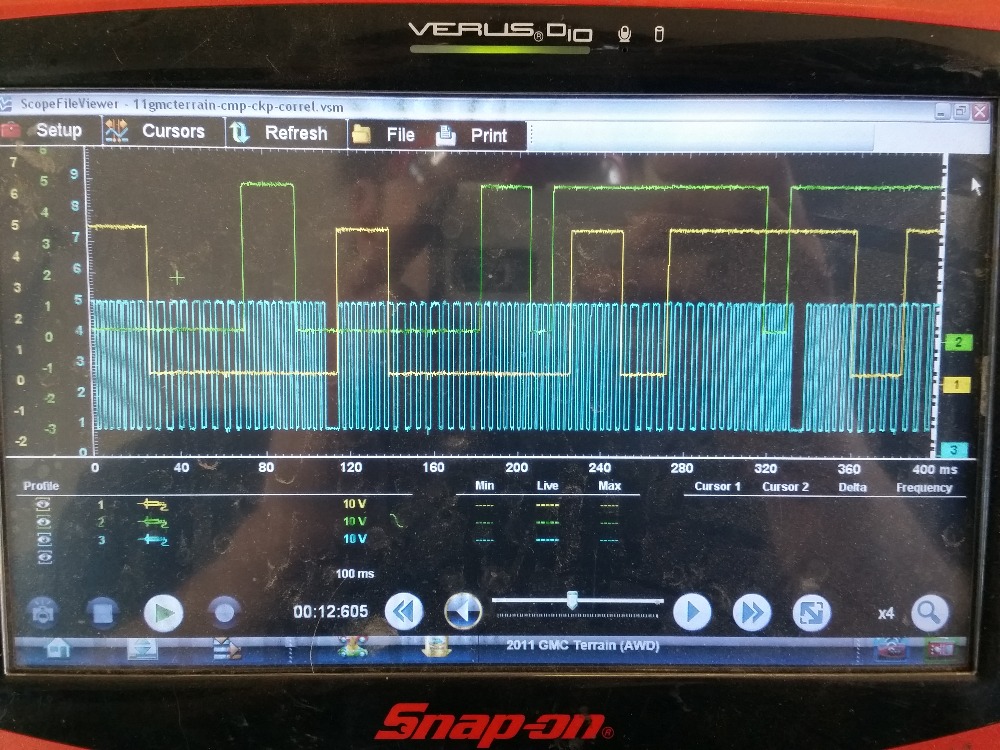 2011 GM 2.4L cam crank correlation waveform shows difference in teeth spacing in cams. iATN Good Running Waveform (after chain replacement)