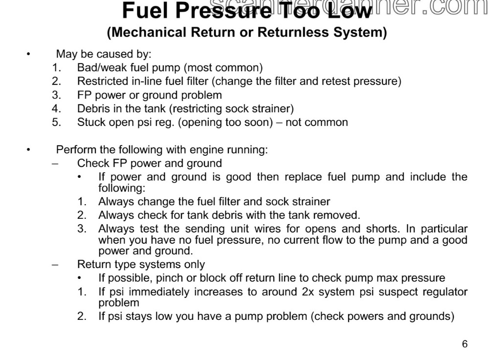 The only concern I have left is the pressure regulator. It's possible it could be stuck open, never closing off the return side and causing low pressure under load. It's unlikely, but possible. From Engine Performance Diagnostics: