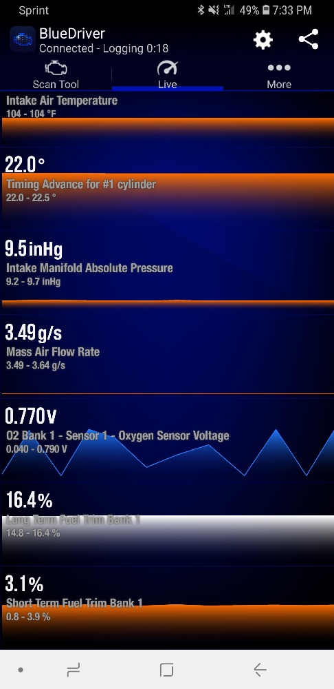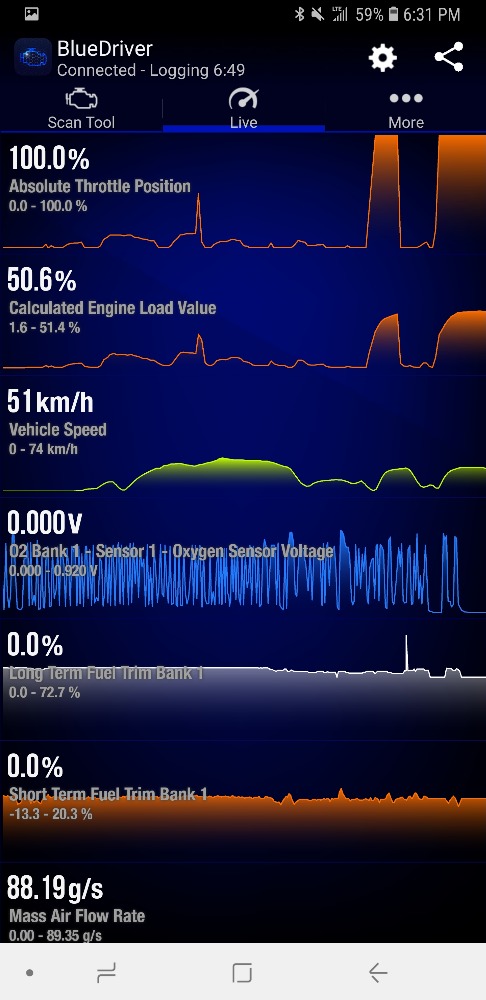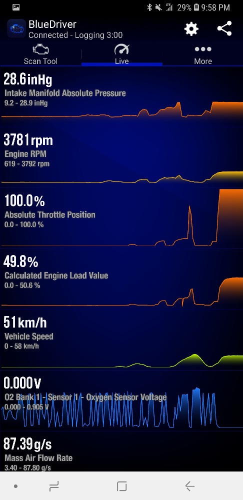 Will your BlueDriver allow you to watch the MAP? Try another WOT run with the engine speed, Load, upstream O2, TPS, MAF and MAP. If the MAP is low, we're looking for an intake restriction.