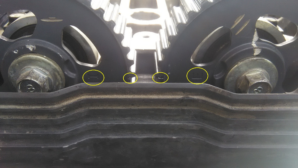 There's an I and a E pointing towards each other, and you can see the timing notches lined up straight across from each other, each circled in yellow.