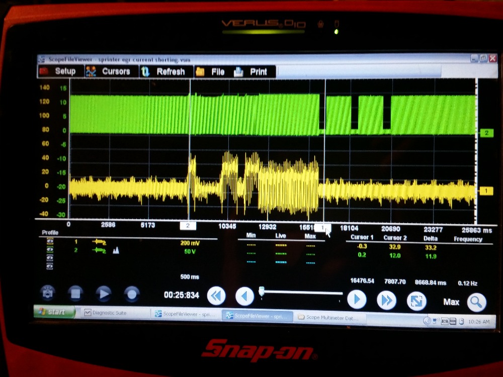 I decided to put on my amp clamp to the power feed to the EGR and I could duplicate those moments when the EGR fails. Looks like its shorting out and then the ECM goes into limp mode and the signal wire, maybe the controller for the signal wire? seems to stop working? I'm having him replace the EGR.