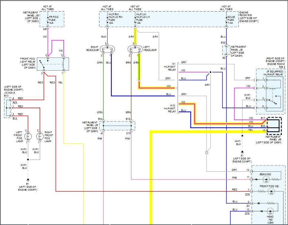 I *think* the circuit you're interested in is the one labeled HL at the headlight switch (which they call the headlight dimmer switch assembly). It's a pretty simple system until you add in the DRL garbage. :sick: If it doesn't have DRL's, then the headlight switch grounds the HL circuit directly. If it does have DRL, then the headlight switch grounds the control side of the H-LP/AMT relay, which then switches the HL circuit to ground.
