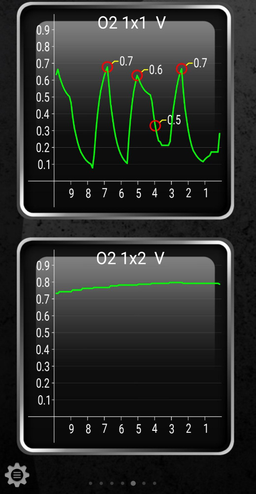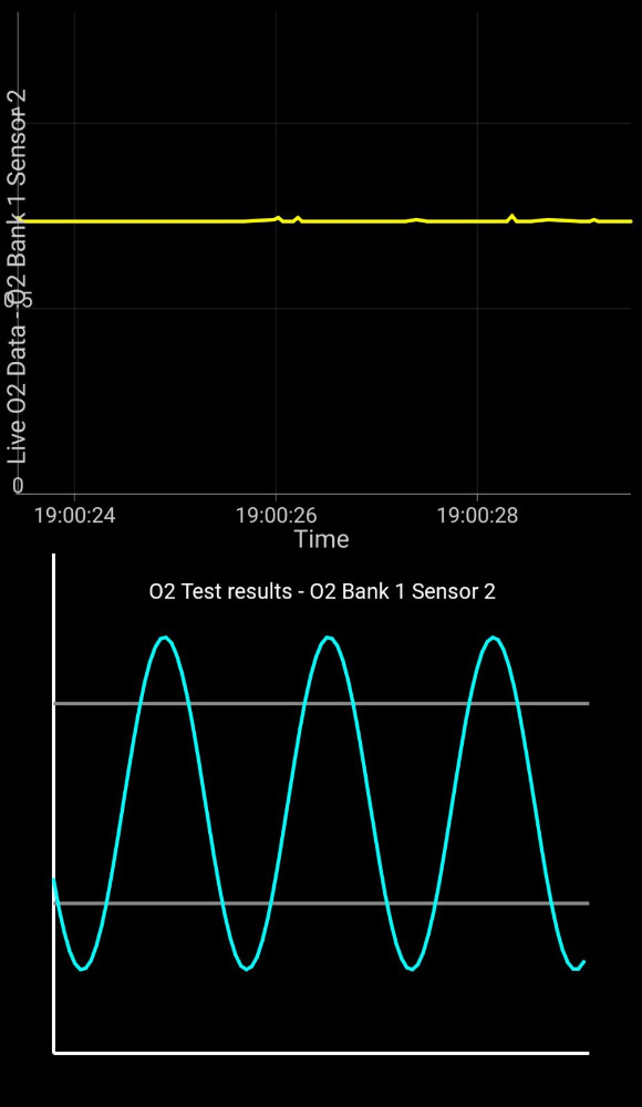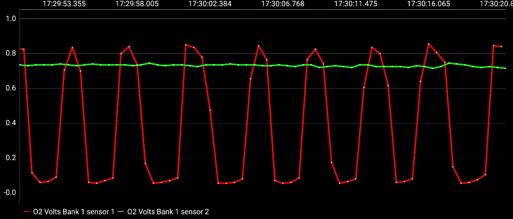 you will see sensor 2 dance around when your on and off the throttle. Sensor 1 should switch from around .1 or 100mv to .8 or 800mv. The high and low point is different from one sensor to another. Some will go as low as 10mv and as high as 950mv. Some will go as low as 150mv to 780mv. All depends on the sensor, the manufacture and other variables we won't know. As long as its switching from low to high usually indicates a functional sensor. There are variables to that such as the sensor switching to slow.