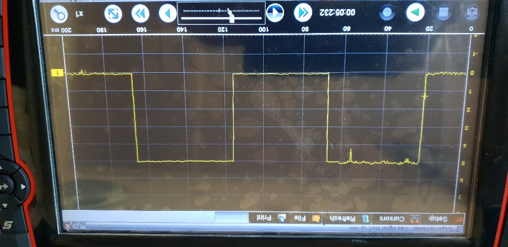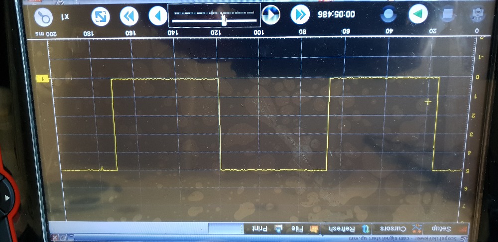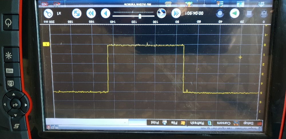 Can you get set you scope to 100ms or 200ms and start recording to capture the cam signal during cranking and at idle. Stop the capture before the buffer starts to overlap. 100ms and 200ms should give you more than enough buffer to hit the stop button. This will tell us if the cam sensor is not picking up the tone ring during cranking. You can then zoom the waveform out to see repetition but you are able to zoom in for detail as well.