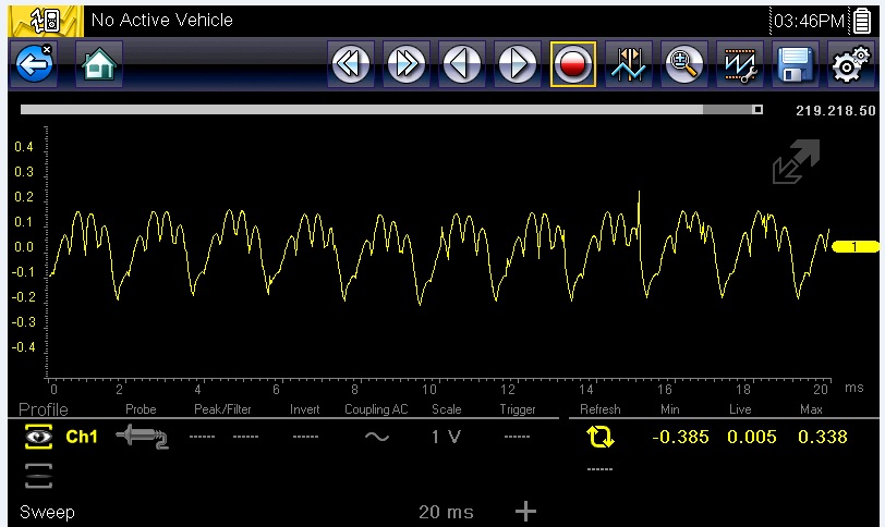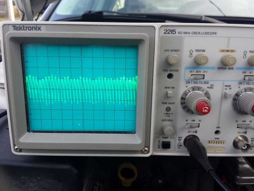 This one had a failed diode and low output. Note the 20ms screen time - that's around what you'll need to see detail in your alternator ripple waveform.