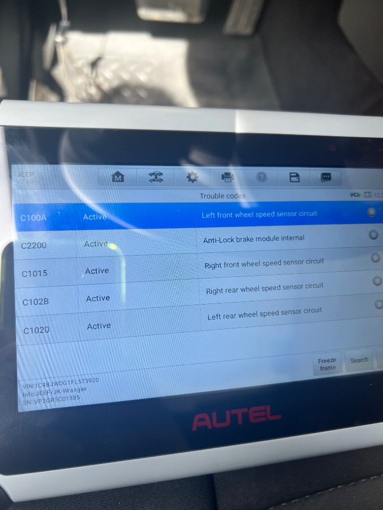 2015 Wrangler ABS codes for all 4 wheel speed sensors
