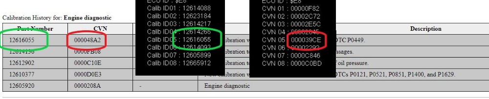 All the calibrations and CVN's match perfectly until you get down to the 'Engine Diagnostic' section. Highlighted for clarity: