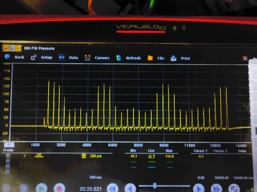 Hi I have this 23 Silverado with a 2.7L in my shop. It has 128000 miles and came in with P0300 and P050D. Cyl 2 is misfiring steadily but not quite a complete miss. The check engine light was not flashing. Relative compression test showed cyl 2 has low compression at least every few engine rotations. Leak-down is only 8% at TDC and 100 psi. Attached are the compression waveforms while cranking. One is zoomed out and the other is closer. I am not familiar enough with compression waveforms to look at this and know exactly what the problem is but what I did notice is the pattern of high then low compression continues to repeat itself but is not completely identical. This engine is equipped with sliding camshaft valve lift. Any help is appreciated! Thanks.