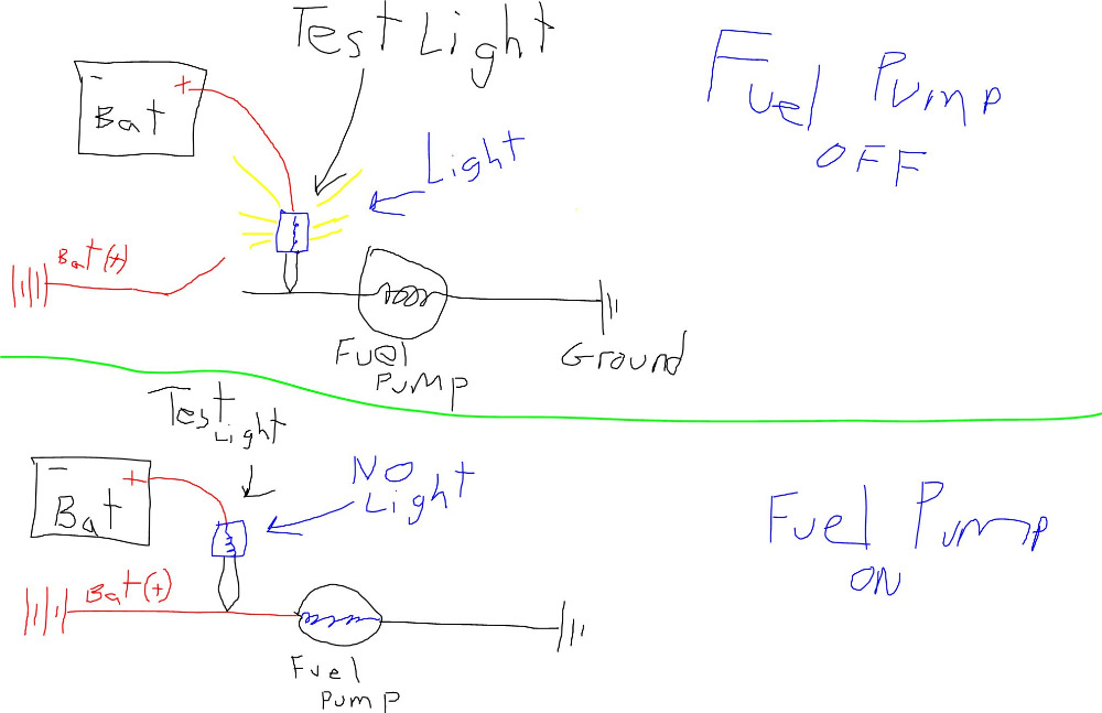 Now, if you energize the fuel pump power feed, it will have battery voltage. If the test light is connected to battery (+), at the battery, and you touch the point of the test light to a wire that also has battery (+), the test light will not light because there is no longer a ground, (and no difference in potential). Your test light will have battery voltage on both ends. Power + Power = No Light
