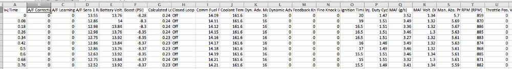 lottadro wrote: Tyler, attached are a slice of the datalogs I had sent to the tuner. I couldn't upload the whole excel file because of format restrictions on site. This is the car at idle. One picture you can see the title of the columns and the other a slice from farther down. You can see the hunting AFR and the fuel correction going wild.